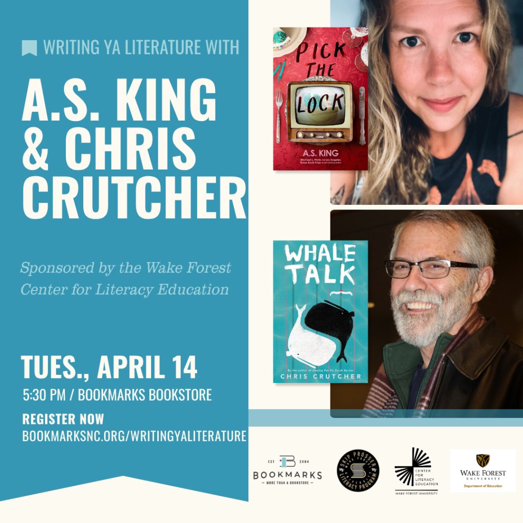 If you cannot make the on-campus panel, feel free to join us at Bookmarks on Tuesday, April 15, 5:30-6:30 pm for “Writing Young Adult Literature with A.S. King and Chris Crutcher.” You can learn more and register here. Bookmarks is located in downtown Winston-Salem at 634 W. 4th Street #110.
