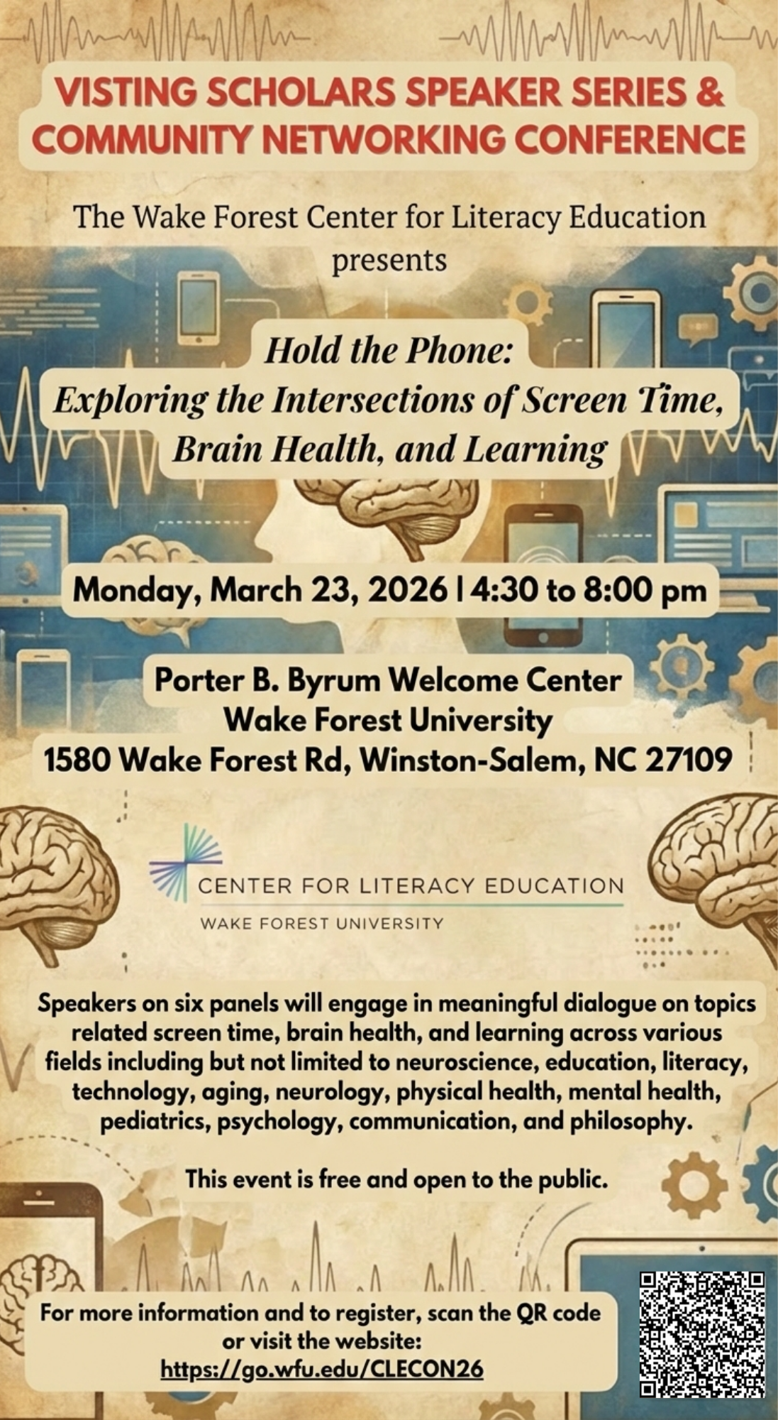 The Wake Forest Center for Literacy Education will host its second annual Visiting Scholars Speaker Series and Community Networking Conference on Monday, March 23, 2026. The event is free and open to the public. It will take place from 4:30 to 8:00 pm at the Byrum Welcome Center on the campus of Wake Forest University.